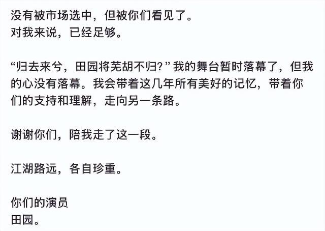 在长文结尾,田园特别感谢了那些在她“不营业、不互动”的日子里依然给予理解与支持的观众,称这份情谊是她职业生涯最珍贵的收获。“没有被市场选中,但被你们看见了。对我来说,已经足够。”她以“归去来兮,田园将芜胡不归?”作结,为自己的舞台暂时画上句号。