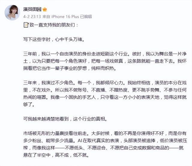 田园的退圈,如同一面镜子,映照出短剧行业在资本、流量与技术冲击下的剧烈变迁。当AI开始“演戏”,流量决定“身价”,那些只想安静做个“手艺人”的演员,他们的舞台又该在哪里?这不仅是田园个人的选择,更是抛给整个行业的一个沉重问号。